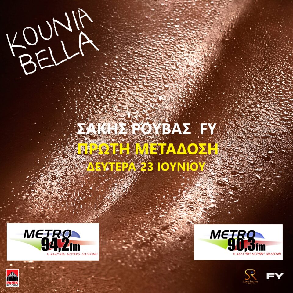 Από την Δευτέρα 23 Ιουνίου συντονιστείτε στον Metro Fm 94.2 (Λάρισα) και στον Metro Fm 90.3 (Λαμία) και ακούστε σε Πρώτη Μετάδοση το Νέο Τραγούδι του Σάκη Ρουβά και του FY “Kounia Bella”. Metro Fm 94.2 & Metro Fm 90.3 No1 Σταθμός σε Λάρισα & Λαμία !